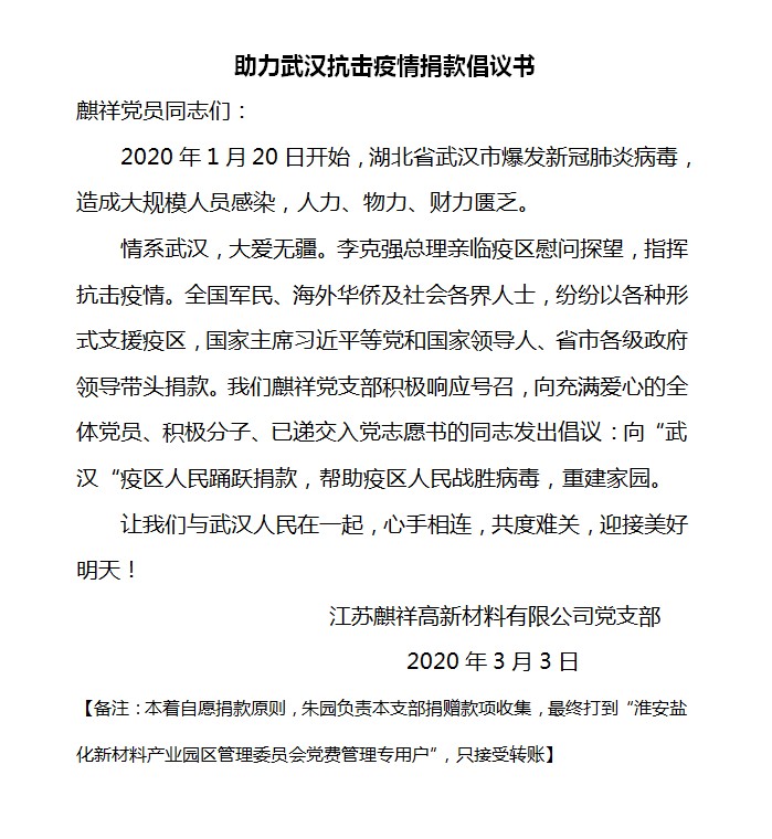 疫情当前,爱心无限。2020年3月3日,是开云足球,开云足球(中国)集团全面复工的第二天,董事长姚翔同志和江苏开云足球,开云足球(中国)高新材料有限公司党支部书记彭华龙同志即号召集团全体党员、积极分子,并带头为支持新冠肺炎疫情防控工作捐款,充分发挥党员模范作用,以实际行动践行初心使命,为打赢疫情防控阻击战贡献力量。