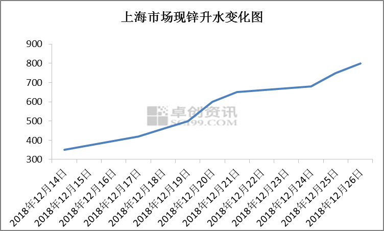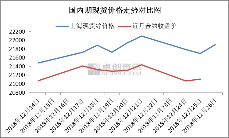 12月20日,卓创预测在现货市场流通偏紧的情况下,锌价有上涨可能。自12月14起,现货市场流通货量持续紧俏,升水一路走高,在期货价格持稳的情况下,现货锌价走高,截至12月26日,上期所沪锌近月合约先涨后跌,价格与12月14日变化不大,微涨0.17%,现货锌价走势与期货走势相近,但总体呈上涨趋势,较12月14日涨420元,涨幅1.96%,远超期货涨幅。