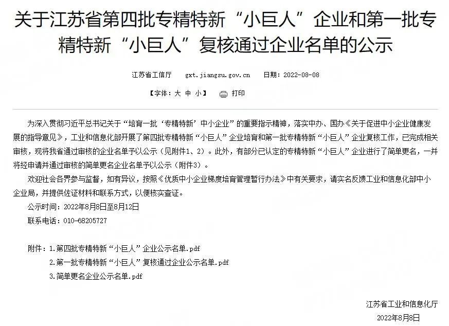 2022年8月8日,工信部委托江苏省工信厅公示了第四批专精特新“小巨人”企业名单,开云足球,开云足球(中国)新材料下属子公司江苏开云足球,开云足球(中国)高新材料有限公司成功入选,荣获专精特新“小巨人”称号,实现了淮安工业园区专精特新“小巨人”企业零的突破。