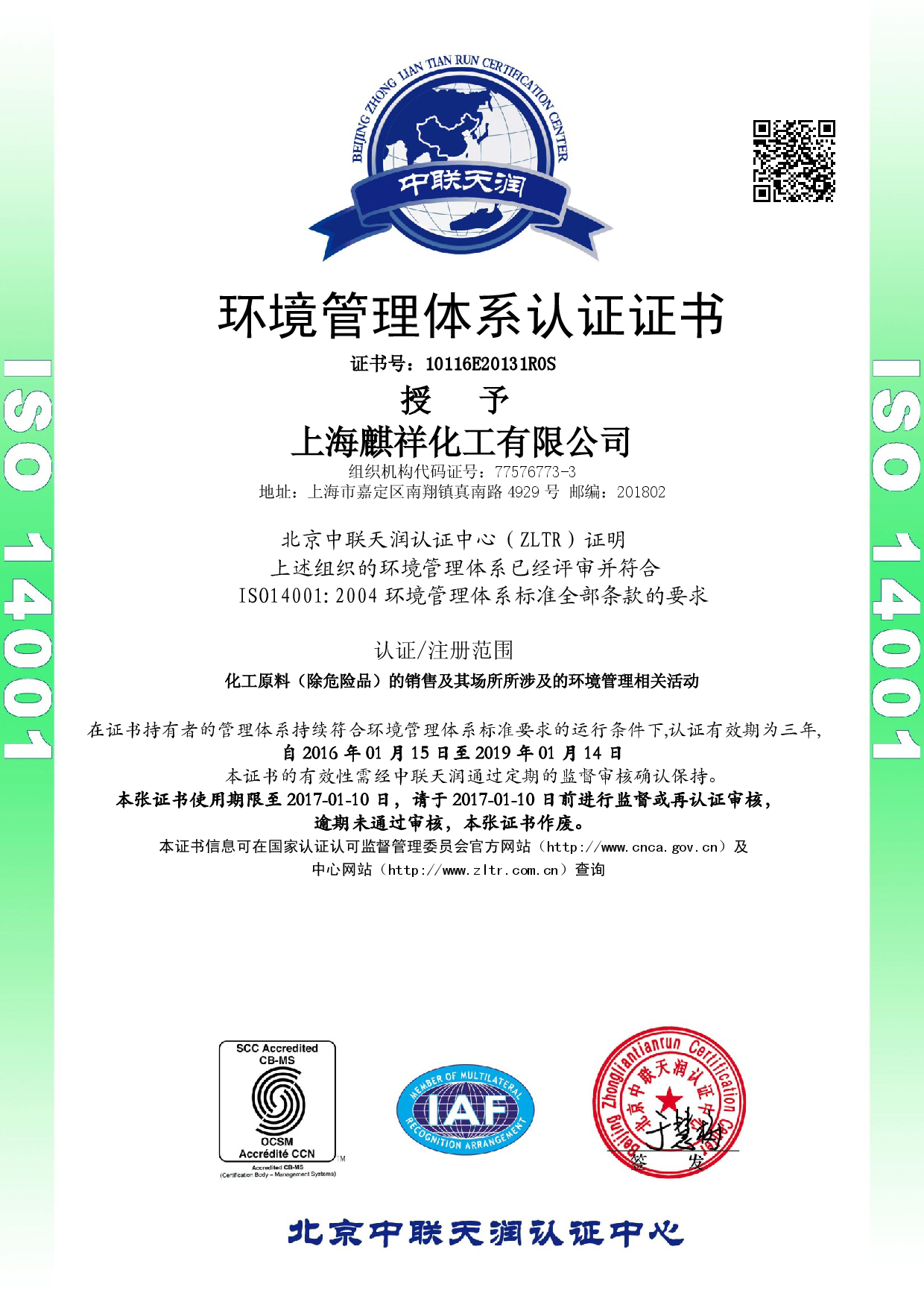 上海开云足球,开云足球(中国)化工有限公司取得ISO14001环境管理体系认证证书