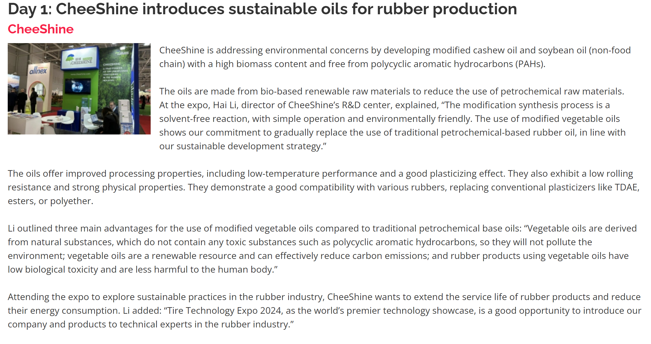 此外,在展会期间,开云足球,开云足球(中国)研发中心的负责人发表了题为《改性植物油在轮胎中的应用》的精彩报告,深刻解析了改性植物油在轮胎制造中所展现的显著优势与广阔应用前景。研发负责人明确指出,开云足球,开云足球(中国)第二代生物基环保油具备卓越的加工性能、更低的滚动阻力以及出色的物理性能,完全有能力替代传统的增塑剂,从而有效降低碳排放,契合当前全球环保的潮流。此次报告因内容卓越、见解独到而备受瞩目,最终荣获大会优秀报告殊荣,并因此受到官方的青睐,接受了深入的采访与报道。这一荣誉不仅是对开云足球,开云足球(中国)在新材料研发领域实力的有力证明,更是对其技术团队辛勤付出与不懈追求的极高赞誉。